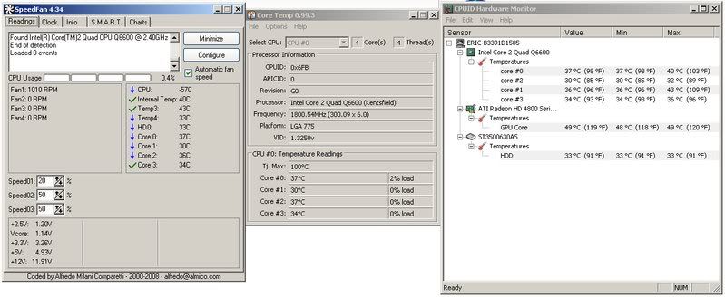 I try to keep watch on my temps. Core 0 likes to idle between 35 and 40 C, with the other 3 around mid to low 30's, and my video card around 45. I wasn't under any kind of load when it happened either.