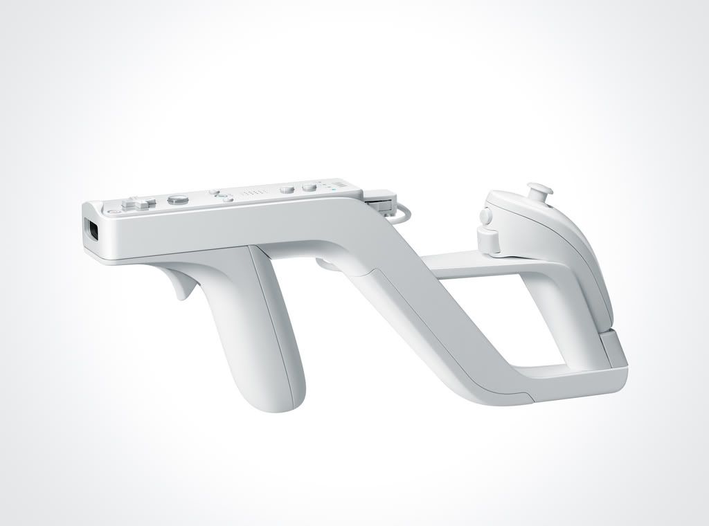 You know what's really funny about this (or maybe me)? The original wii-zapper concept, I knew exactly what it would feel like to hold: Right hand on the pistol grip, left hand under the "barrel" for support. Because of the location of the trigger on this new version, I can't tell if I'd be more comfortable holding it with my right hand on the forward grip because that trigger finger is probably quicker, or with my left hand on the forward grip since I'm more inclined to hold the rear grip with my right hand. :\ |