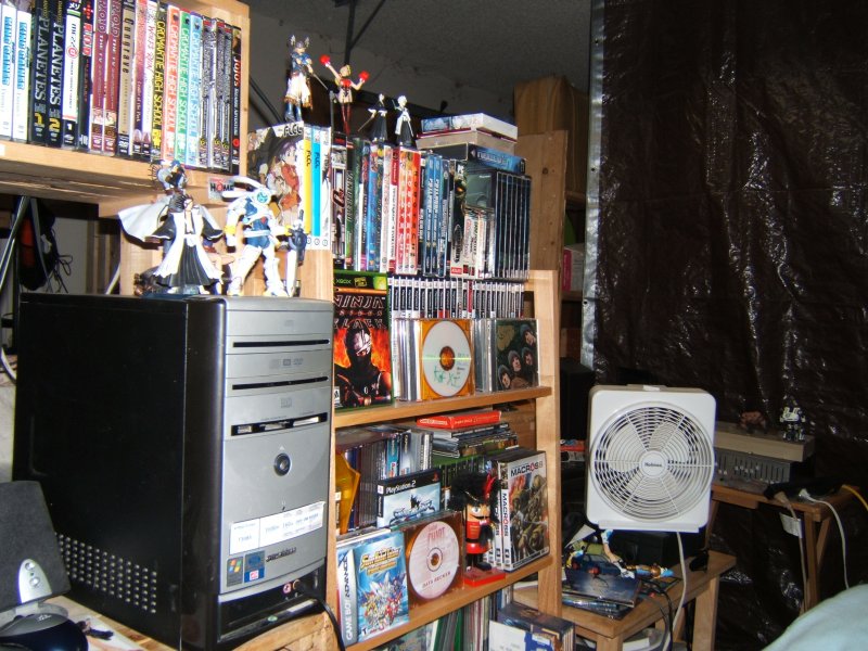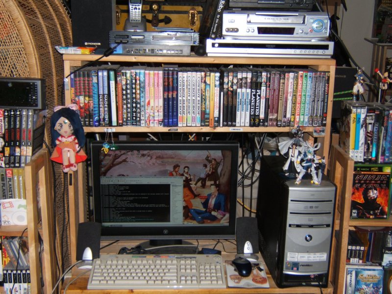These pics are a few months old, but most of the stuff's in the same locations. Just imagine that there's an Xbox 360 shoved under the PS2 and the keyboard has been moved to a slide-out holder and the 360 controllers sitting where the keyboard used to be. Also, my shitty Last Exile Collector's Box Set Mousepad finally destroyed itself, so my mouse is freeballing (or freelasering, technically) for the moment.