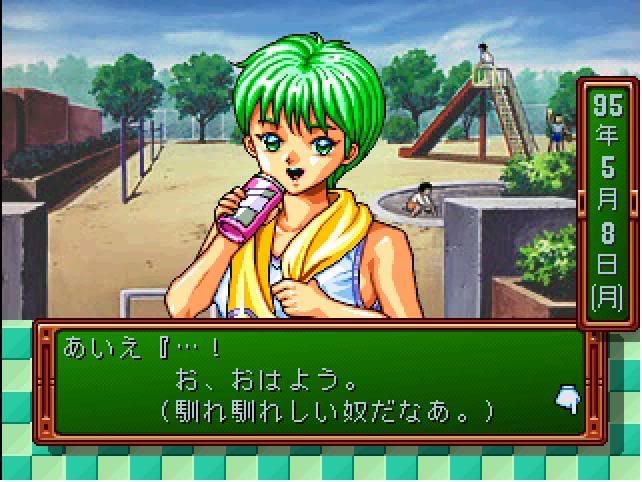 Now, the girl I'm pursuing is Saki Nijino. My buddy tells me she likes sports but isn't that good at them. She is in to men who sweat profusely while immersed in sport. With this in mind I begin working out obsessively so that I can build up enough perseverance. During my first jog of the day I bump in to Nozomi Cantrememberherlastname. This girl is completely in to sports as evidenced by that smart little yellow towel wrapped around her neck. She also appears to be drinking some sort of canned beverage that no doubt provides much needed energy.