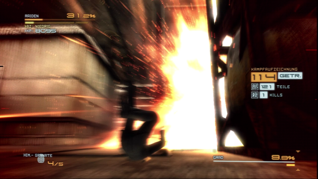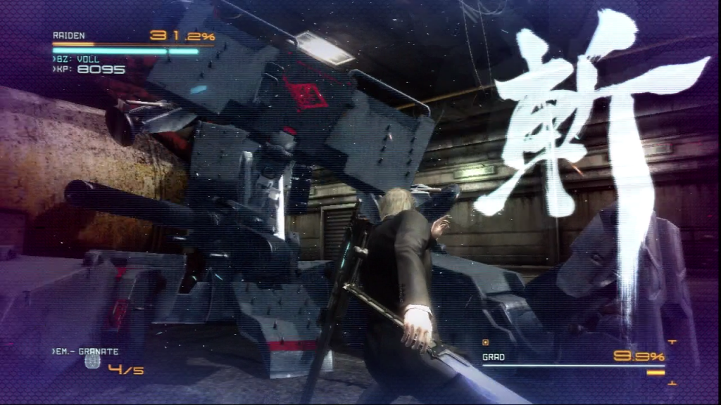 Weird. Most of my deaths during this fight come from the GRAD that's off screen. A few different things will happen... I'll focus on the GRAD in front of me and suddenly MISSILE BARRAGE (possibly pre-indicated by an orange reticule on Raiden, though I'm not sure if this consistently is indicated that way). Alternatively, I'll be fighting one of the GRADs, try to get some distance, and find that I'm running in place because the other GRAD has snuck up on me and is translucently blocking my path.