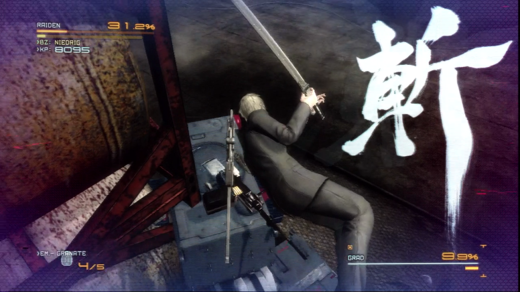 I suppose it's worth noting that killing seems ultimately necessary in stealth play (I mean this in contrast to MGS, obviously not in contrast to combat play in MGR). Some zones, I can slip through without interacting with any enemy at all. But others, like the little stretch of road between the fight with LQ-84i and the bridge, and the interior of the refinery, have enemies placed precisely so that the only way through them appears to be to (stealth-)kill at least one or a couple of them to create the gaps that I need, or all of them. MGS games tend to encourage the player to couple stealth tactics with a non-lethal disposition. So of course in MGS, playing stealthily, playing "well," means devising ways of slipping through zones with minimal to zero cost, including in terms of harm caused and sometimes more broadly in terms of any and all interactions with sentries. In MGR, though, playing stealthily means picking out which enemies to neutralize, deciding in what order to neutralize them, and so on. And the stealth kill is an always lethal action (I don't know yet if it's non-lethal with the wooden sword), and so are the other attacks that seem able to eliminate targets without triggering an alert. And this is just the ground of the experience. In fact it's only when every enemy in a zone has been eliminated that a member of the support team will praise Raiden and declare him the stealth expert he's known to be, and the game does this not just the first time a zone is cleared stealthily, but every time. In other words, the game consistently and practically explicitly encourages the player to kill everyone even when it's no longer necessary to progression. Everyone dead is the result the game wants. My feeling in stealth play is less that I'm being like Snake, working out how to get by without being harmed or causing harm, and more that I'm a predator stalking prey, which helps to make the sentries feel to me even more like what mechanically, conceptually, they are: a cross of the sentries and animals in MGS3. A stealth kill doubles, after all, as elimination of an enemy and as a much easier opportunity to Zandatsu.