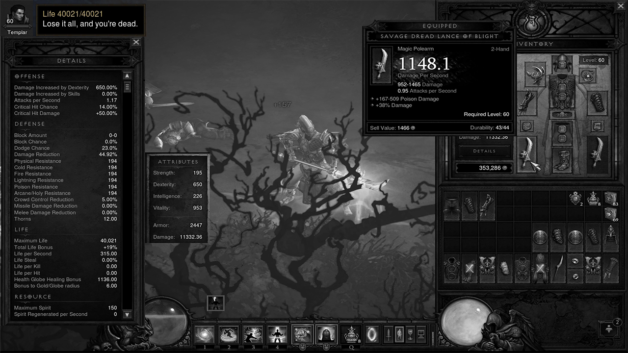 Just killed Inferno Belial on my demon hunter earlier, which felt pretty great. I've been trying to up my survivability on the character instead of doing JUST the typical die-in-one-hit-nukemaster. The good piece I have besides my necklace is a pair of pants with about 550 armor on it, and then 173 dex and 255 vit. _________________ I'm on Steam! ----- I'm on Youtube!